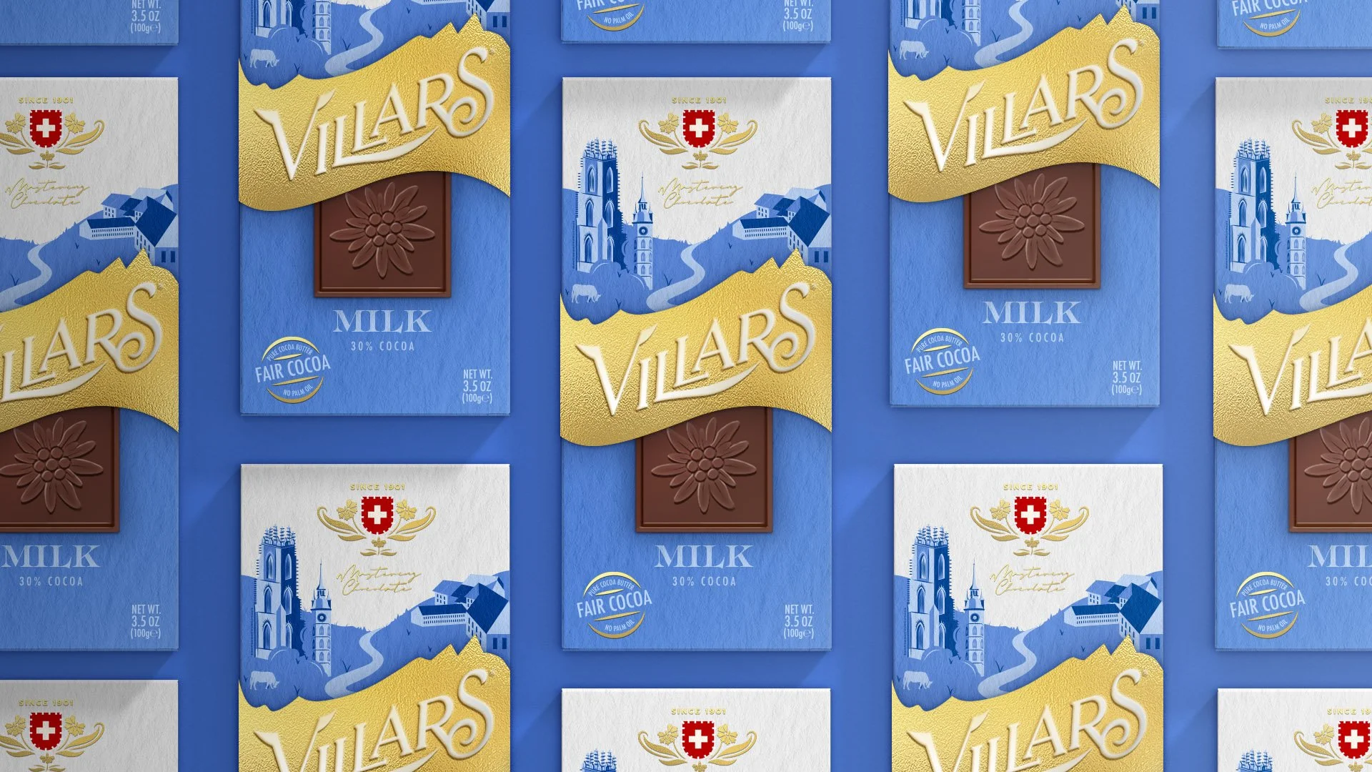This reimagined packaging brings Villars’ Swiss heritage to life through a hand-illustrated landscape inspired by the city of Fribourg. The scene flows seamlessly from front to back, turning the chocolate bar into a continuous story rooted in place and tradition. The art direction is warm, refined, and nostalgic — blending detailed linework with gold-foil accents to elevate the everyday indulgence.